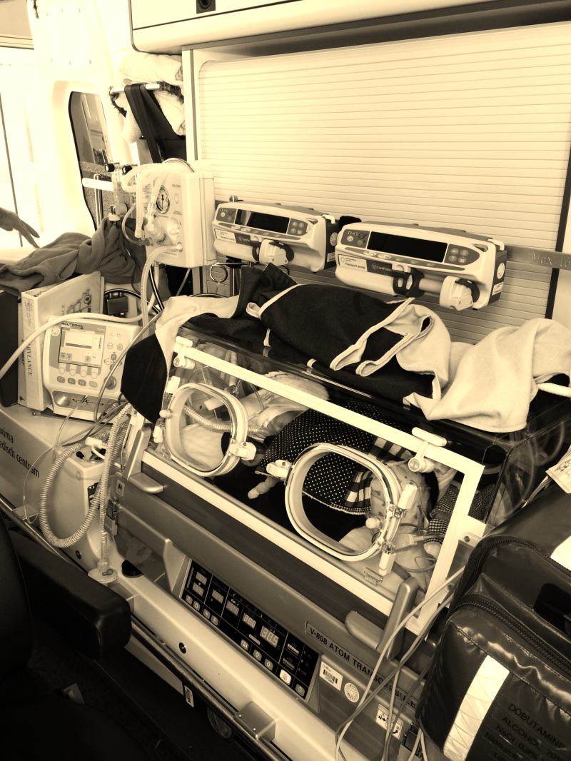 Om 9.00u komen we bij je aan in het ziekenhuis, ruim op tijd, dachten we! Tot onze verbazing lig je al in de babylance.. Een grote brancard met een couveuse erop en alle andere apparaten die nodig kunnen zijn onderweg.. Het is een indrukwekkend gezicht om je zo te zien liggen onder je dekentje (lees spuugdoekje) van stichting Fieke*. 😕