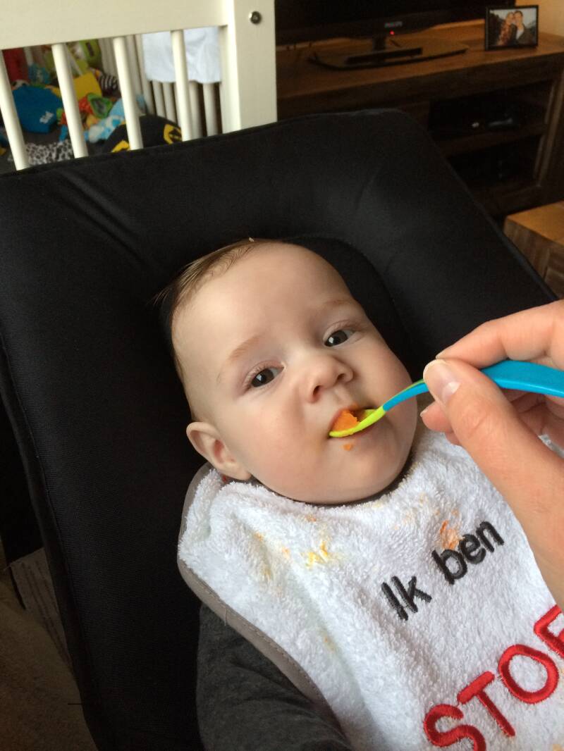 Vriendje, vriendje, wat ga je toch hard!! Je bent zo'n ontzettend lekker, vrolijk mannetje! Sinds 14 april eet je groente.. We zijn begonnen met wortel..