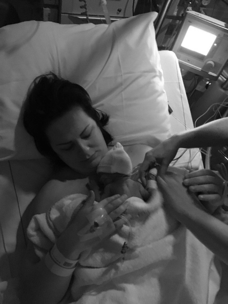De uitslag van de scan kwam en ik moest blijven. Na nog wat testen bleek ik zwangerschapsvergiftiging te hebben en mocht ik niet meer naar huis. Mark is naar huis gegaan en heeft spulletjes gehaald. Hij moest het aan Boris (3) uitleggen dat mama komende nachtjes in het ziekenhuis moest logeren. Rust, dat was het magische woord. We kregen een groeiecho op vrijdag en daaruit bleek dat ons dochtertje te klein was. Er kwam regelmatig visite en er gingen een paar dagen van rusten voorbij.. Op zondagmiddag zaten we in het restaurantje van het ziekenhuis lekker te eten en kwamen er wat mensen op visite. Gezellig gekletst en gegeten en toen terug naar de kamer. Mark kwam 's avonds nog een keertje alleen terug zonder Boris. Die op en neer geslingerd werd van de ene oma naar de andere.. Zo makkelijk en lief. Wat kan je dan toch trots zijn! Zondagavond ging Mark naar huis en toen hij thuis was belde hij nog even. Daarna ging ik slapen, rond 23.00u werd ik wakker en dacht ik naar de wc te moeten. Ik stapte uit bed en ik verloor er ineens heel veel bloed. Ik liep snel naar wc trok aan de bel. De verpleegkundige kwam binnen en wilde me afschepen met een maandverbandje en een schone onderbroek maar ik wees haar naar het bloedspoor wat vanuit mijn bed tot aan de badkamer liep.. Waarna ze gelijk de CTG en gynaecoloog halen. Tijdens de CTG hoorde we gelukkig een hartslag wat een ontzettende opluchting was. De gynaecoloog kwam binnen en nam een kijkje waarna hij mij aankeek en vroeg of ik mijn man al gebeld had... Uhh nee..?! Dan ga dat maar doen want we gaan nú een keizersnede doen. Ik zei nog tegen hem dat dat niet kon want mijn kleintje was nog niet klaar! Maar geen tijd te verliezen. Om 23.25u belde ik Mark op en die is gelijk naar het ziekenhuis gekomen. In de tussentijd waren ze mij al aan het klaar maken voor de operatiekamer. Mark was er nog niet en ze brachten me naar de OK, ik was zo ontzettend bang! Bang om alleen ons dochtertje ter wereld te moeten brengen, bang om ons meisje te verliezen, bang voor wat komen ging. Net voor ik de operatiekamer binnen gereden werd kwam de beveiliger aanlopen met Mark. Zo blij dat hij op tijd was. Toen ging alles helemaal in een sneltrein vaart, ik kreeg een ruggenprik en zo snel als deze werkte gingen ze aan de slag...